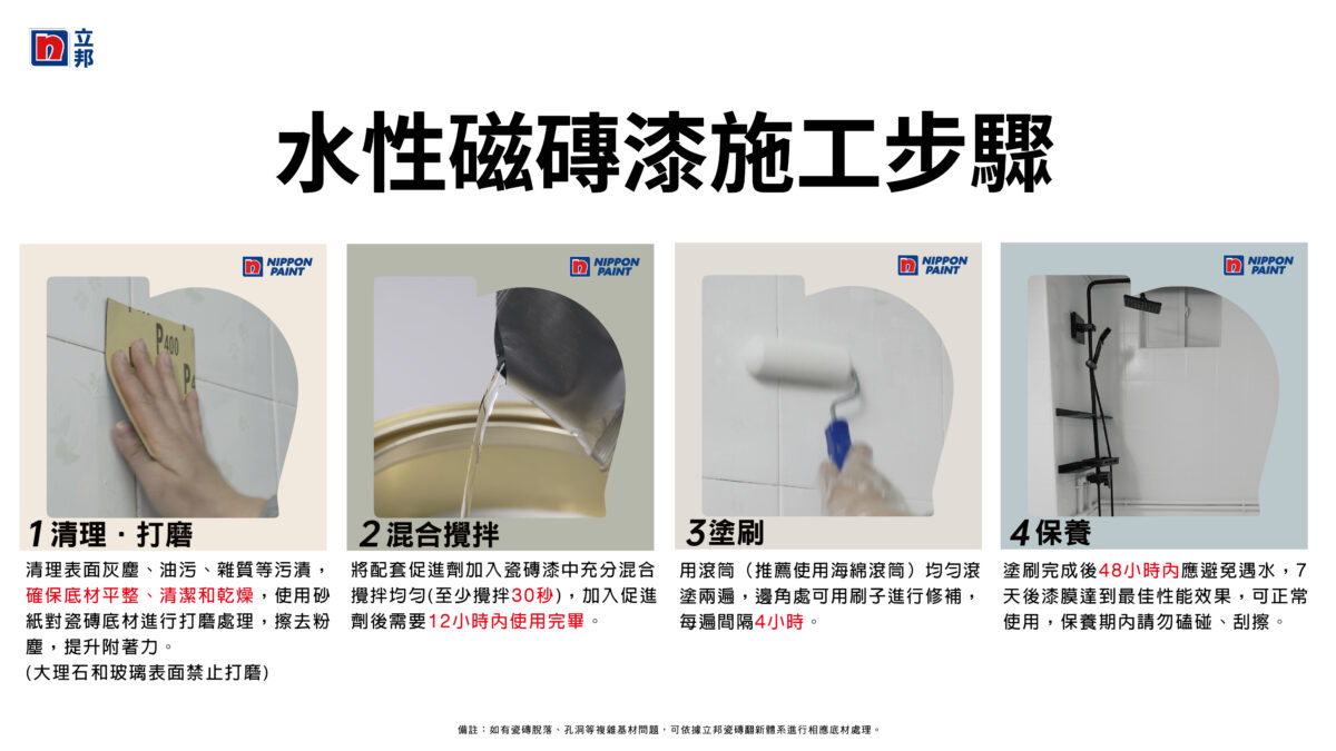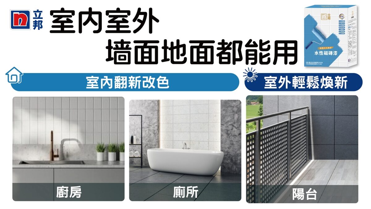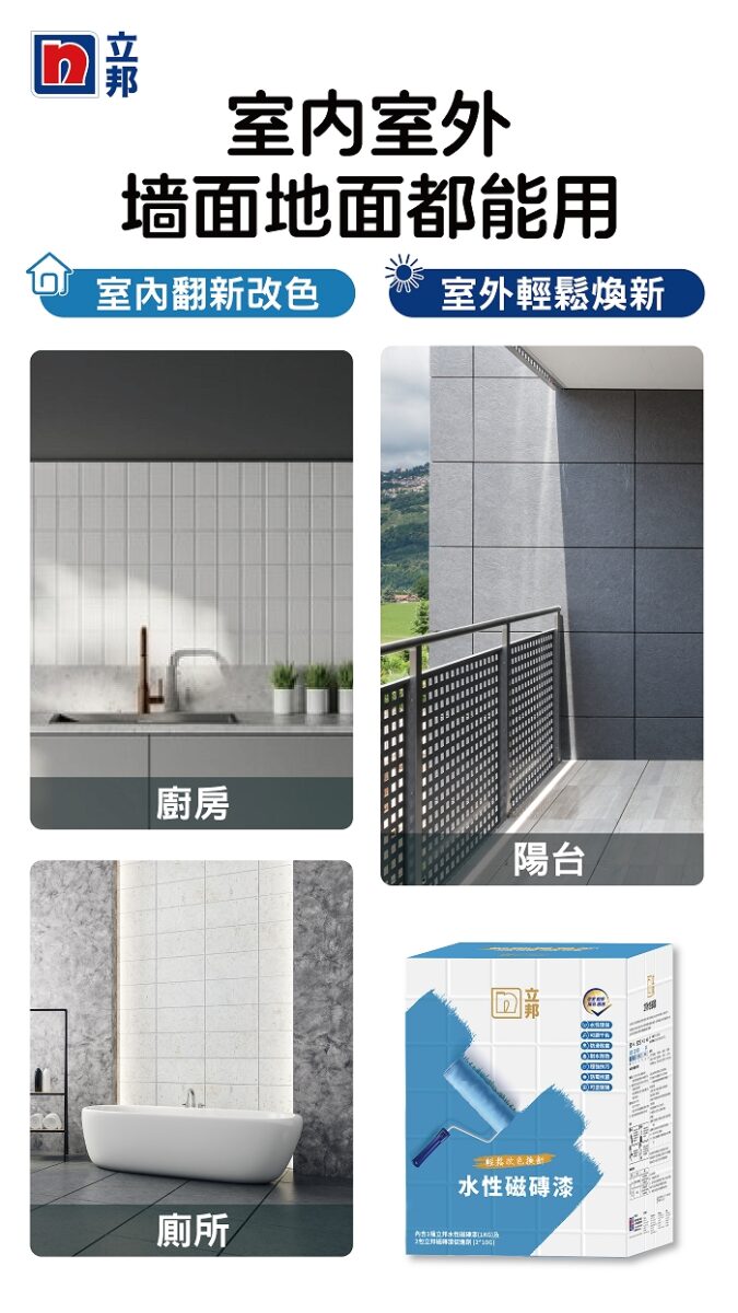 立邦水性磁磚漆通過(guò)96h耐水、1小時(shí)耐沸水、1小時(shí)耐酒精擦拭與耐紫外線(xiàn)照射老化的嚴(yán)苛測(cè)試,適用多種場(chǎng)景,廚房、廁所、陽(yáng)臺(tái)等場(chǎng)景皆適用,牆面、地面與陽(yáng)臺(tái)瓷磚、玻璃、木造廚櫃等皆適用,施工簡(jiǎn)單快速,新手也能快速上手。(*註:木地板請(qǐng)勿使用)
