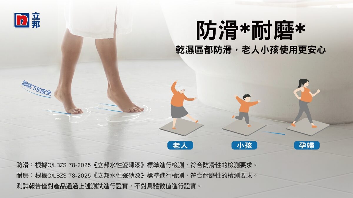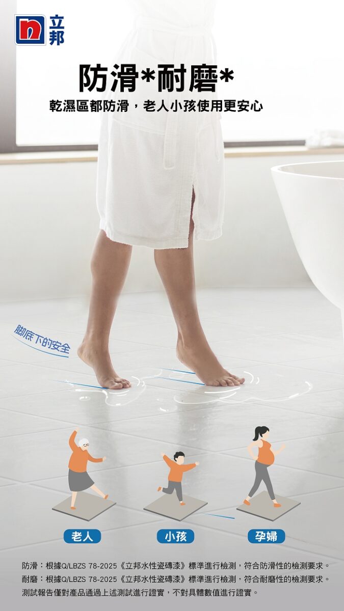 家人的安全是最重要的事情!立邦水性磁磚漆可以施作於地板磁磚,乾區(qū)與溼區(qū)都防滑,刷新改色同時(shí)兼顧安全效能,家中有長(zhǎng)輩、小孩、孕婦更是安全加分。