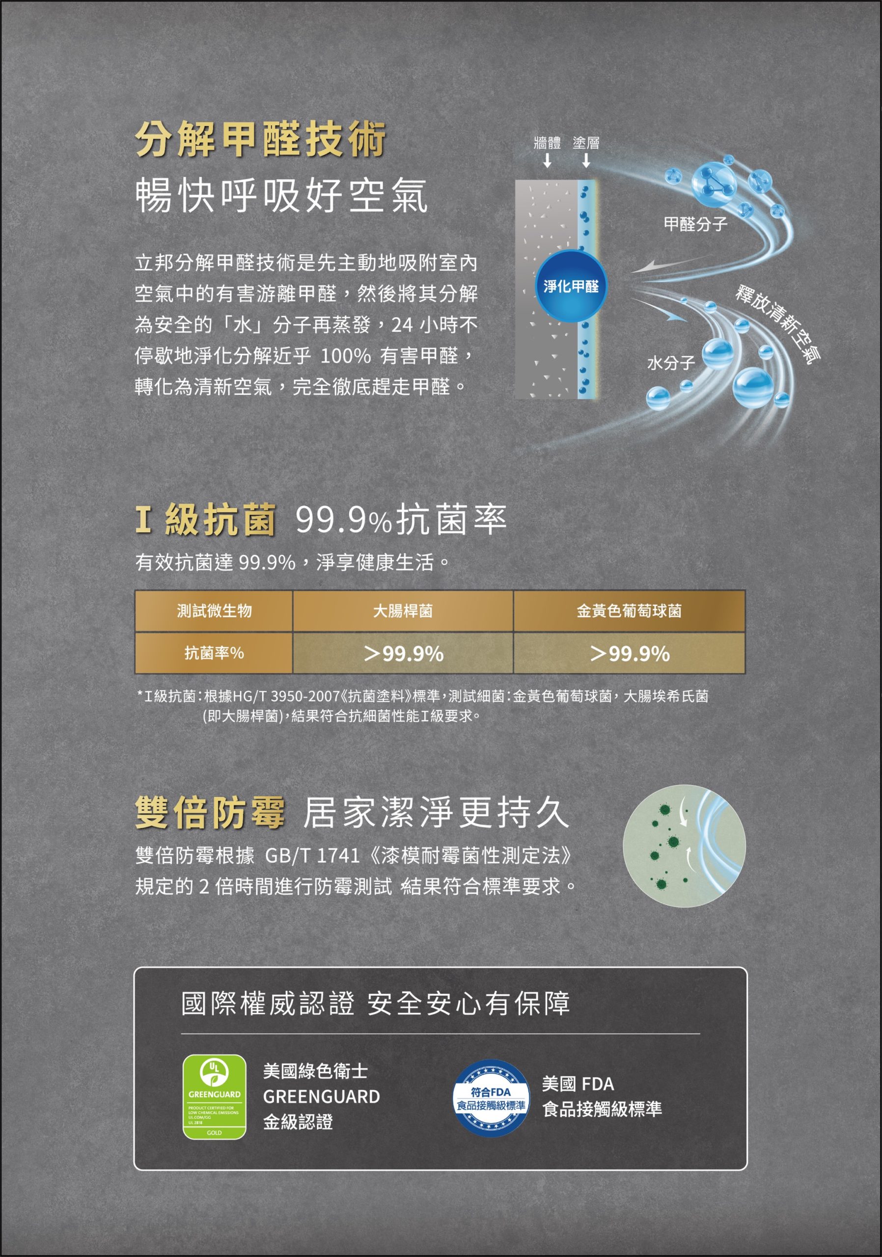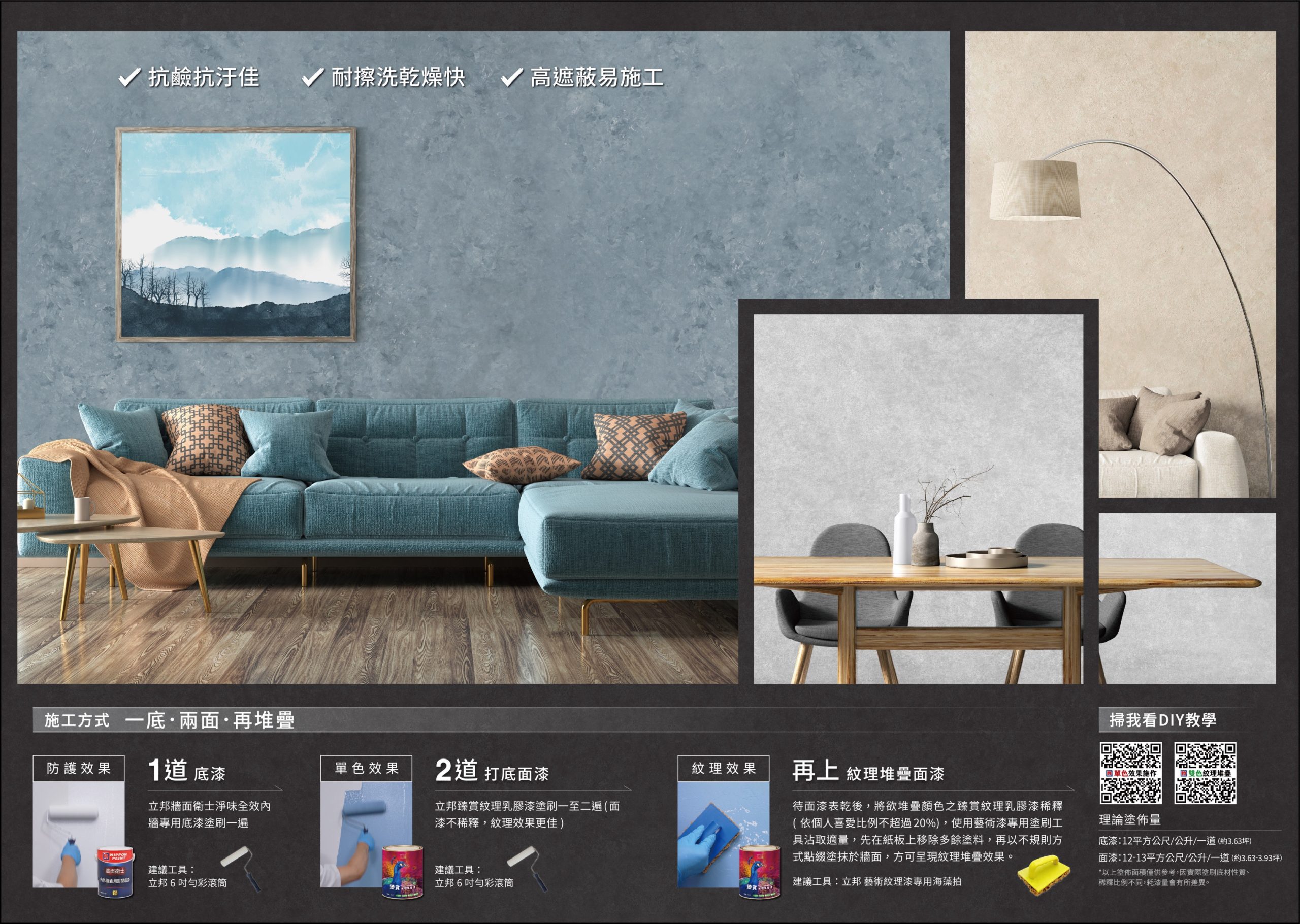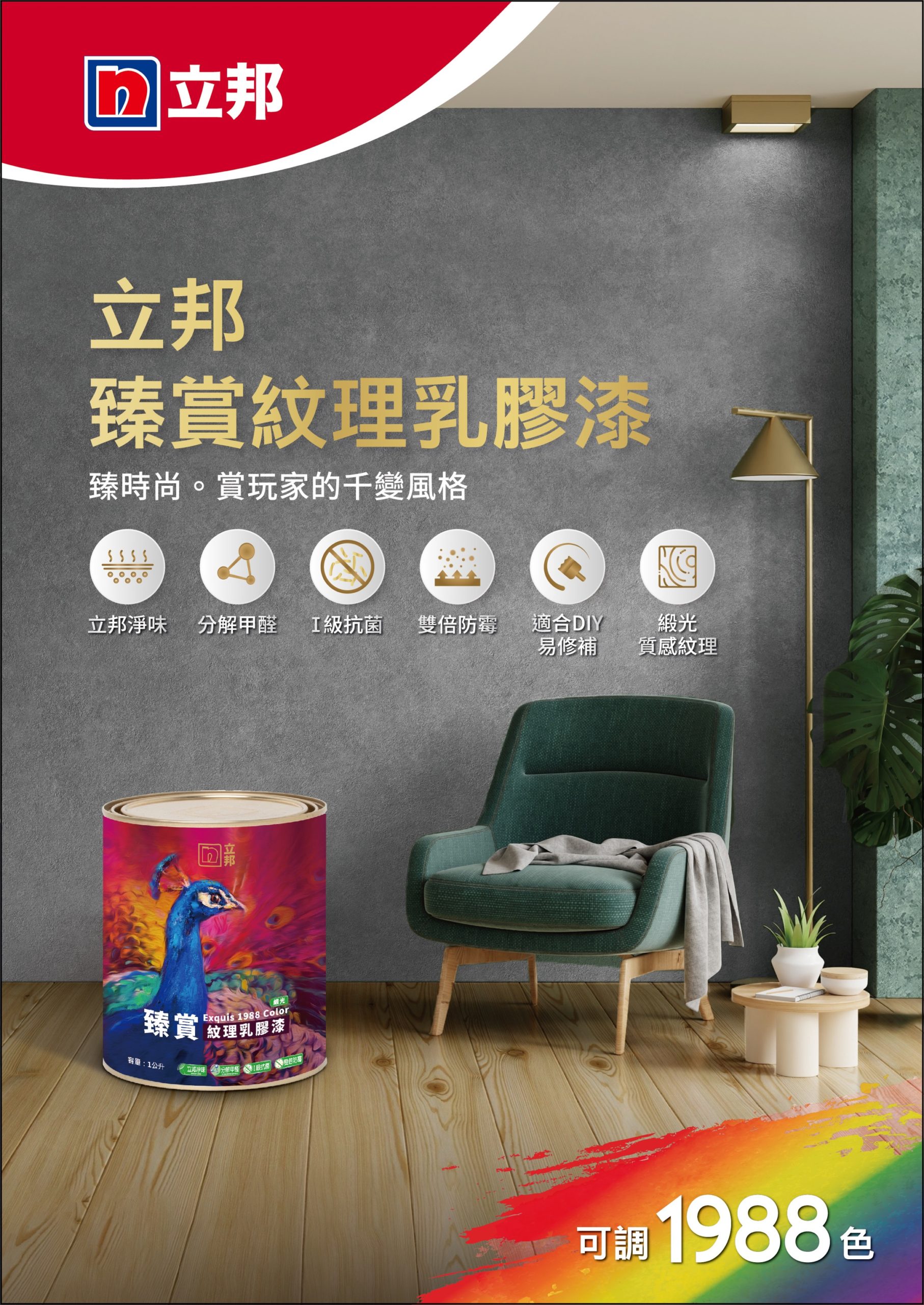 立邦臻賞紋理乳膠漆,首創(chuàng)強大性能紋理乳膠漆,緞光質感紋理、適合DIY易修補,商品本身淨味不含甲醛還能同時?分解室內游離甲醛 + I級抗菌 + 雙倍防霉 三大創(chuàng)新科枝。立邦臻賞紋理乳膠漆,可調1988色自由創(chuàng)作,單色紋理效果讓牆面質感升級;雙色紋理堆疊效果圍牆面增添自我風格。同時性能強大,淨味無添加、不含甲醛且可分解空氣中游離甲醛、I級抗菌、雙倍防霉,DIY簡單好修補,臻時尚,賞玩家的千變風格。